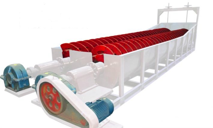 洗砂机工作时,电机通过三角带、减速机、齿轮减速后带动叶轮缓慢转动,砂石有给料槽进入洗槽中,在叶轮的带动下翻滚,并互相研磨,除去覆盖